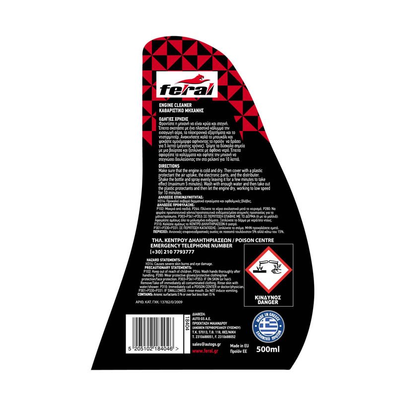 Καθαριστικό Μηχανής Feral 500mlTο καθαριστικό μηχανής Feral είναι ένα προϊόν μοναδικής σύνθεσης που καθαρίζει αποτελεσματικά κάθε είδους μηχανή, αλλά και εργαλεία, μεταλλικά μέρη με συσσωρευμένη βρωμιά κτλ. Ιδανικό για χρήση και σε συνεργεία αυτοκινήτου. Απομακρύνει εύκολα και γρήγορα λάδια, γράσα και επίμονες βρωμιές με ένα ψεκασμό.Οδηγίες Χρήσης:Φροντίστε η μηχανή να είναι κρύα και στεγνή. Έπειτα σκεπάστε με ένα πλαστικό κάλυμμα την εισαγωγή αέρα, τα ηλεκτρονικά εξαρτήματα και το ντιστιρμπιτέρ. Ανακινήσετε καλά το μπουκάλι και ψεκάστε ομοιόμορφα αφήνοντας το προϊόν να δράσει για 5 λεπτά ( μέγιστος χρόνος). Τρίψτε τα δύσκολα σημεία με μια βούρτσα και ξεπλύνετε με άφθονο νερό. Έπειτα αφαιρέστε τα καλύμματα και αφήστε την μηχανή να στεγνώσει δουλεύοντας την στο ρελαντί για 10 λεπτά. Ελληνικό προϊον Λεπτομέρειες Προϊόντος Περιεχόμενο: 500ML Μοντέλο Μάρκα: Universal Μοντέλο: Universal Χρονολογία: Universal